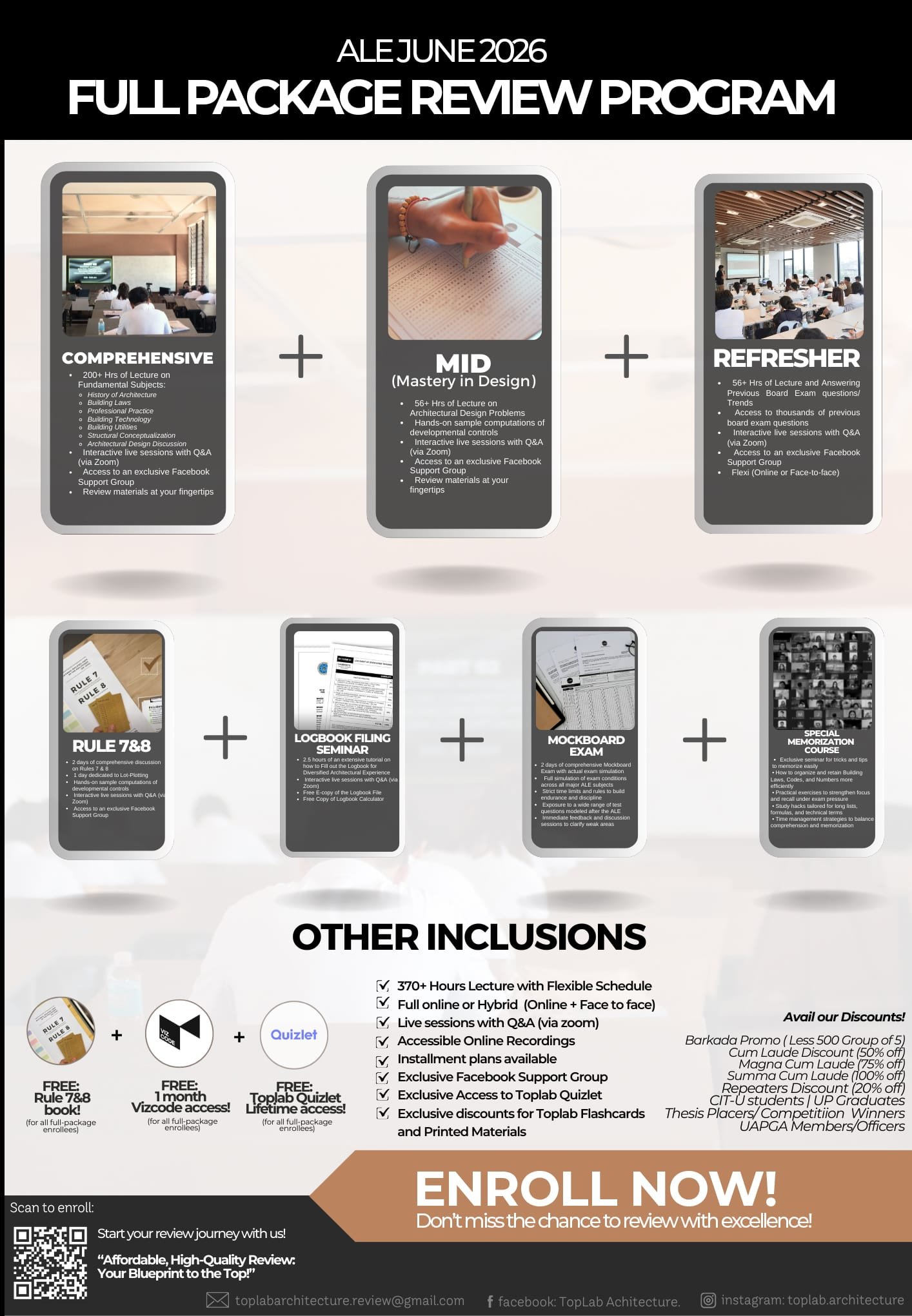 A complete and structured review covering all major LEA subjects—from comprehensive, Rule 7&8, Mastery in Design, Special Memorization Course, Refresher, Mockboard and Final Coaching–ideal for first-time takers who want full preparation from foundation to final recall.